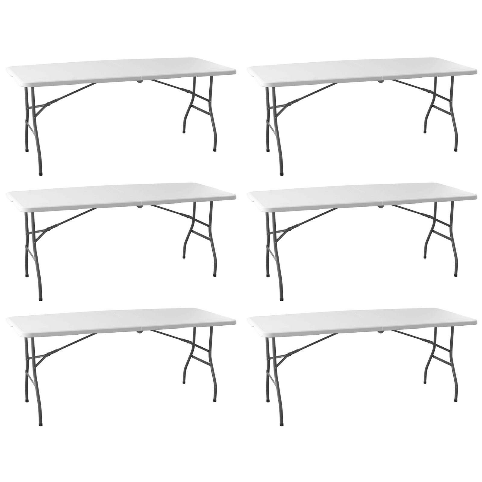 Mesa de jardín plegable blanca fabricada en HDPE con estructura de acero resistente. Ideal para exteriores, eventos y reuniones. Fácil de transportar, sin montaje y de diseño moderno.
