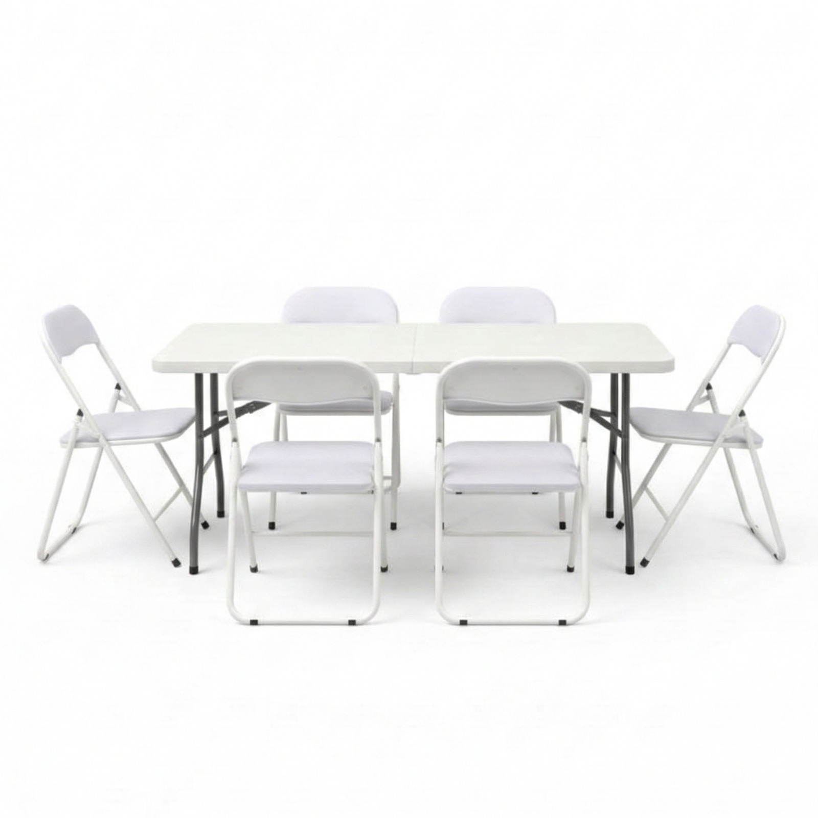 Diseño actual y luminosidad para tus eventos. Un conjunto 100% plegable que incluye una mesa rectangular de 180 cm y 6 sillas blancas de líneas modernas. Estilo, robustez y practicidad en un solo pack.