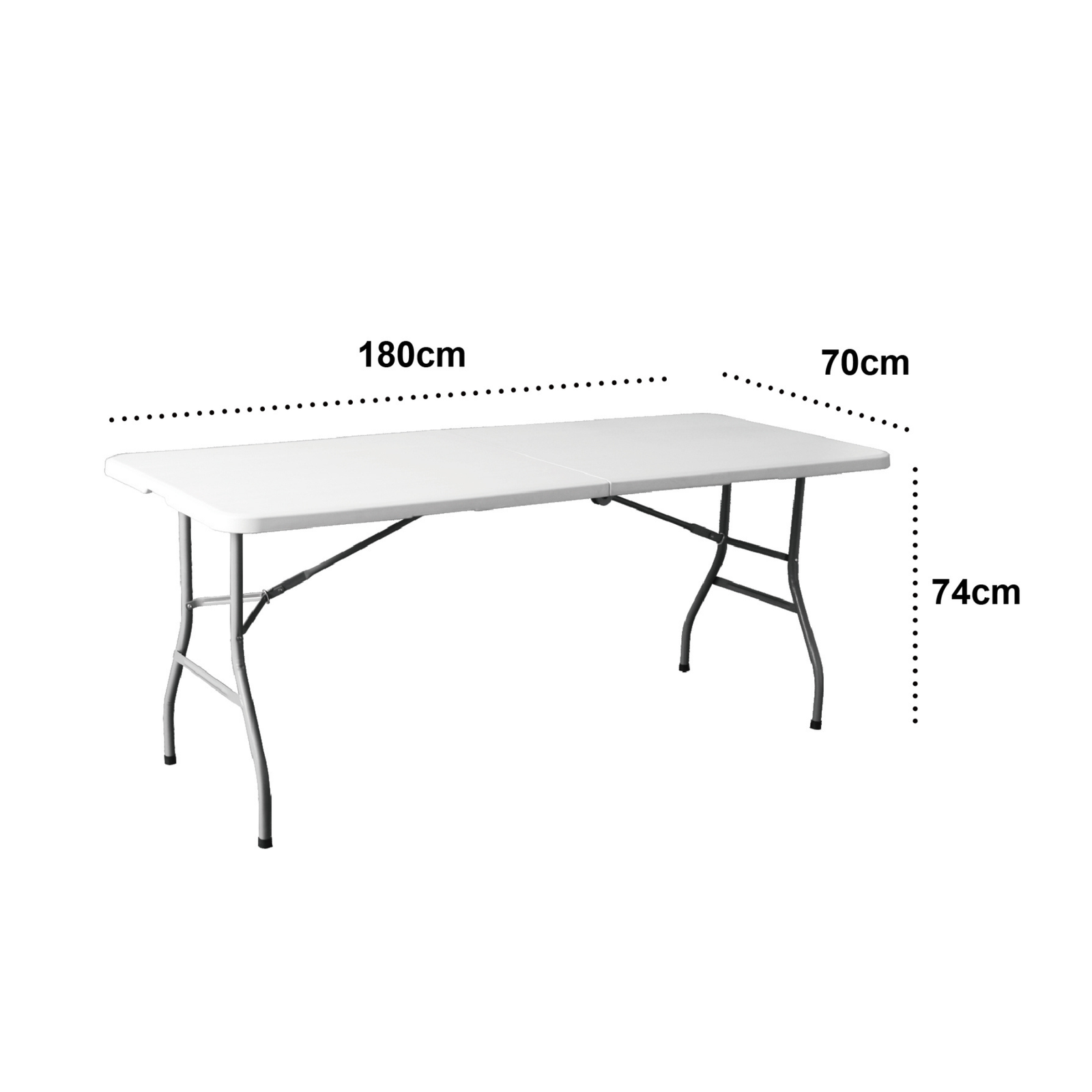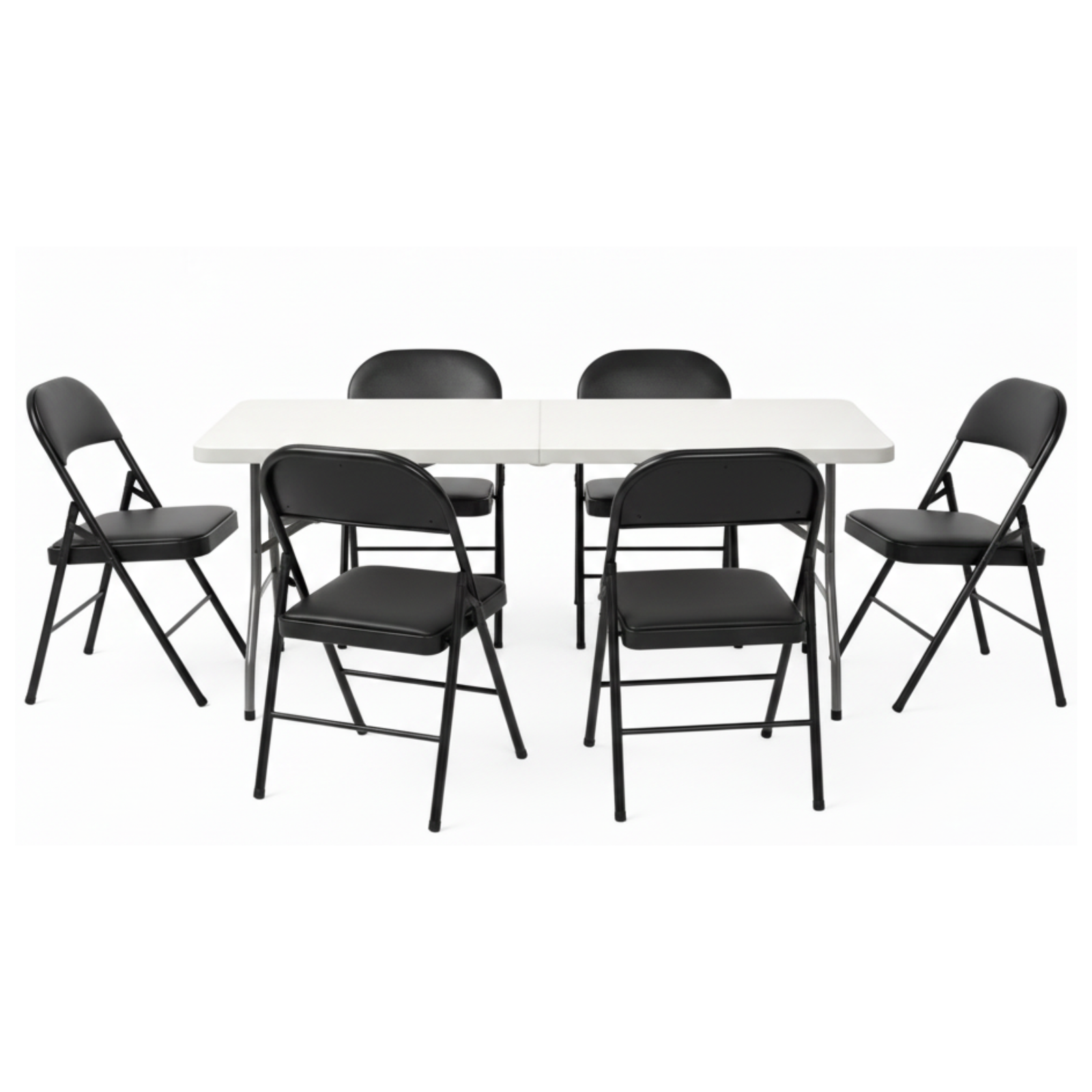 Sofisticación bicolor y comodidad superior. Equipa tu evento en segundos con este pack que incluye una mesa blanca tipo maleta de 180 cm y 6 elegantes sillas negras plegables con asiento acolchado para eventos prolongados.