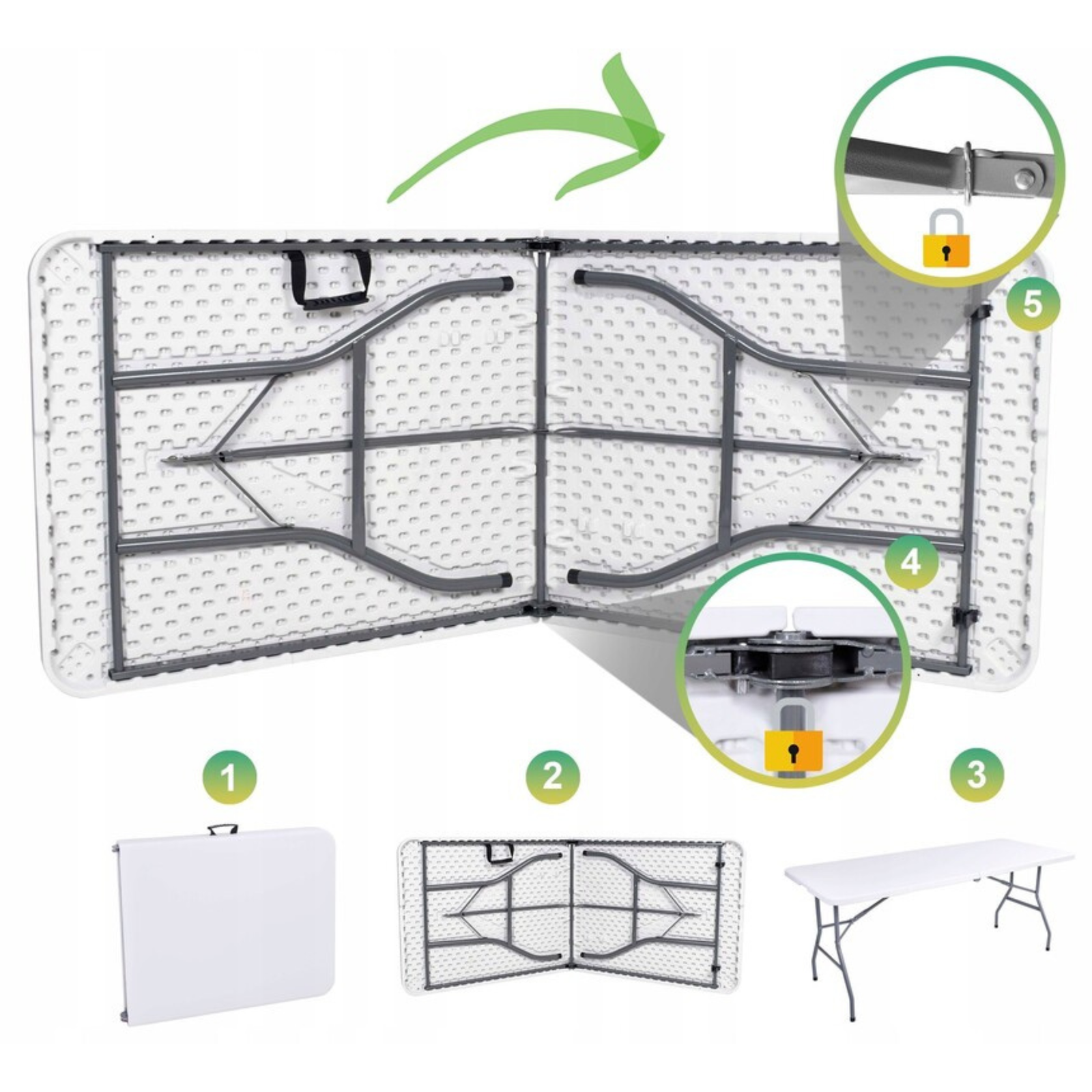 Montaje Cero: Listo para usar al instante. La mesa se pliega por la mitad como una maleta con asa, y las sillas se guardan de forma extraplana, ahorrando el máximo espacio.